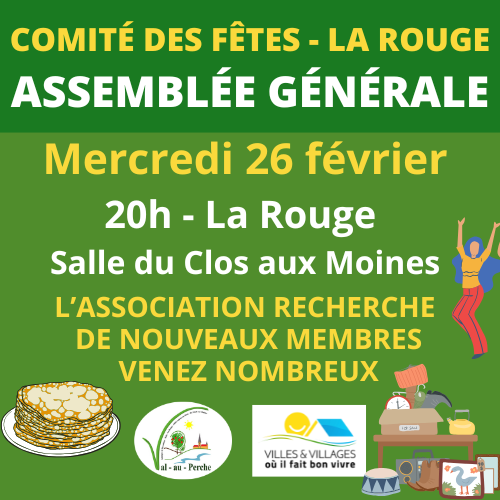 Mercredi 26 février – 20h : assemblée générale du Comité des Fêtes de La Rouge à la salle polyvalente du Clos aux Moines.