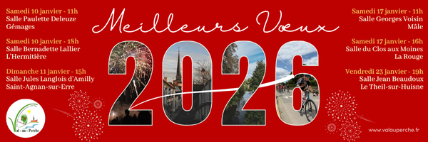 Comme traditionnellement, la municipalité de Val-au-Perche a décidé d’organiser une cérémonie dans chaque commune historique à l’occasion de la nouvelle année. Sébastien Thirouard, Maire de Val-au-Perche, son équipe municipale ainsi que le Conseil municipal des Jeunes sont heureux de convier les Perchevaloises et Perchevalois aux cérémonies des vœux 2026 qui se dérouleront respectivement :