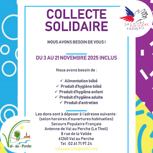 Le Secours Populaire Français, antenne de Val au Perche (Le Theil), organise une collecte solidaire du 3 au 21 novembre 2025 inclus.