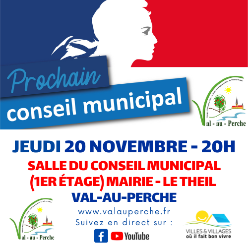 Le conseil municipal se réunira le jeudi 20 novembre à 20h dans la salle du conseil (1er étage), 5, place de la Mairie – Le Theil 61260 Val-au-Perche.