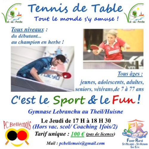 Le Ping-Pong reprend de plus belle, dès le jeudi 11 septembre 2025, de 17 H à 18 H 30, au Gymnase du Theil avec le Foyer Rural de St Hilaire-St Agnan ! Et avec des tarifs à la baisse ! Pour que tout le monde puisse jouer et s’entraîner le tarif est de 100 € pour l’année (de septembre à juin) avec des réductions selon l’âge des enfants.