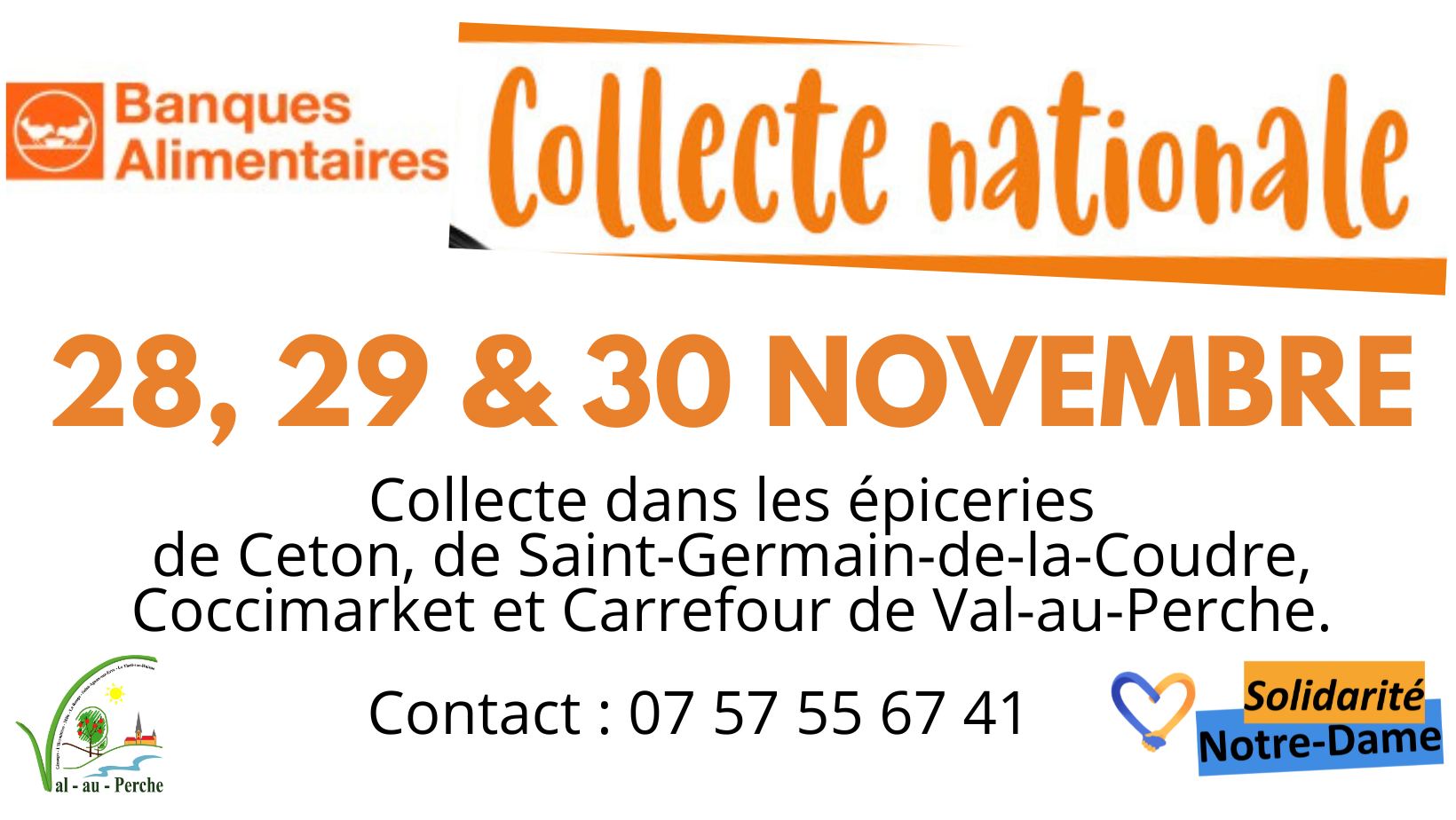 Les bénévoles de l’association Solidarité Notre-Dame seront présents les 28, 29 et 30 novembre dans les épiceries de Ceton, de Saint-Germain-de-la-Coudre, au Coccimarket et au Carrefour de Val-au-Perche pour la collecte nationale de la Banque Alimentaire.