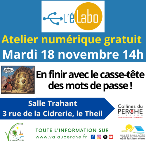 Nous apprendrons à ne plus se prendre la tête avec nos mots de passe lors de l’atelier qui aura lieu ce mardi 18 novembre à 14h, au siège de la communauté de communes, salle Trahan, 3 rue de la Cidrerie.