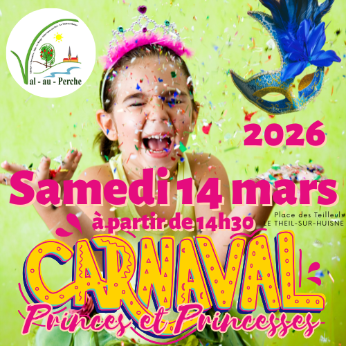 La ville de Val-au-Perche organise son traditionnel Carnaval le samedi 14 mars 2026. Princes et Princesses ont rendez-vous à 14h30 sur la Place des Teilleuls au Theil-sur-Huisne, pour un départ du défilé à 15h. « Les carnavaliers seront accueillis à partir de 14h30 par Madame et Monsieur Loyal, échassiers et jongleurs, avant de démarrer le défilé dans une ambiance musicale festive et familiale », précise Heidy Moulin, Conseillère déléguée à l’organisation du Carnaval. Le cortège sera accompagné en musique jusqu’au Stade du Pressoir, où la compagnie The Dreamlighters Show proposera des chorégraphies et cirque traditionnel d’antan à l’arrivée des carnavaliers vers 16h avant l’embrasement de Monsieur Carnaval par des cracheurs de feu. « Buvette et vente de crêpes seront proposées sur place et sur présentation du flyer distribué aux écoliers de Val-au-Perche une crêpe et une boisson seront offerts aux enfants » précise Lyliane Mousset, adjointe déléguée à la Vie associative. Rendez-vous le samedi 14 mars 2026 au Theil-sur-Huisne pour le grand défilé du Carnaval de Val-au-Perche.