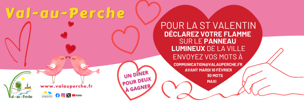 Si votre cœur déborde d’amour au point d’en faire part à tous ceux qui vous entourent, c’est possible à Val-au-Perche. Pour la troisième année consécutive, la commune propose à l’occasion de la Saint-Valentin d’afficher les mots d’amour de ses habitants sur les panneaux lumineux et les réseaux de la Ville. Vous avez jusqu’au mardi 10 février pour adresser votre mot à la mairie, au service communication, 30 mots maximum, à l’adresse communication@valauperche.fr.