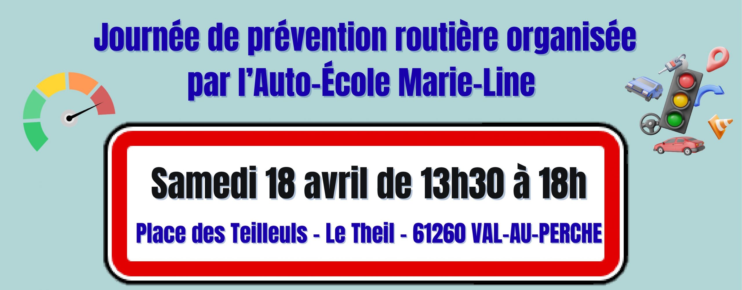 Samedi 18 avril 2026 de 13h30 à 18h sur la Place des Teilleuls au Theil est organisé par l’Auto-école Marie-Line un après-midi prévention routière :