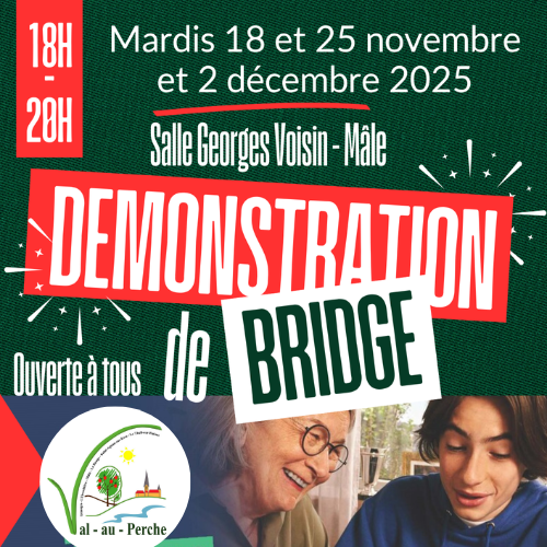 Ces constats ont conduit le Club de bridge nogentais à solliciter un partenariat avec la ville de Val-au-Perche afin de proposer à ses administrés des ateliers de découverte du bridge : 3 séances gratuites qui seront animées des passionnés du club : les mardis 18 et 25 novembre, ainsi que le 2 décembre 2025 de 18h à 20h à la salle Georges Voisin de Mâle.