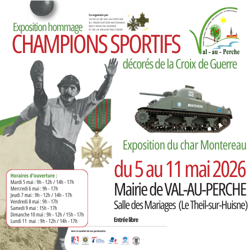 « Il y a quelques mois, au gré des échanges avec Géry Bailliard autour de l’exposition sur les sportifs décorés de la Croix de Guerre, il a été évoqué la possibilité de faire venir le char Montereau », explique Sébastien Thirouard, Maire de Val-au-Perche. Ce char, livré par les Etats-Unis en 1943, alors qu’il est en route pour participer à la libération de Paris, est pris sous le feu ennemi le 12 août 1944 à Alençon.Ce sera l’occasion pour les élèves des écoles primaires et du collège de venir admirer ce morceau du Patrimoine Normand, le Char Montereau et visiter l’exposition.