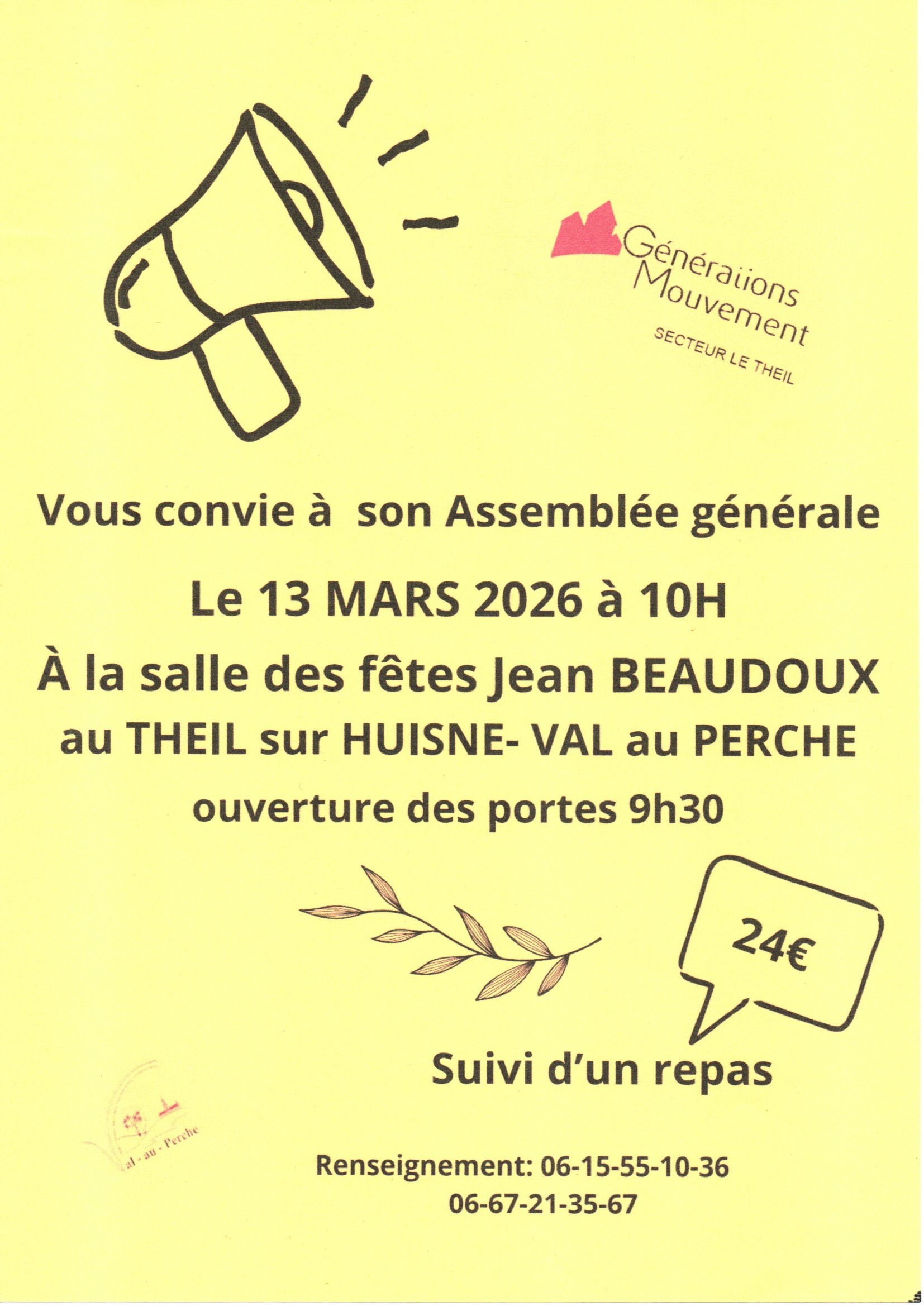 Assemblée générale de l’association Générations mouvement à 10h à la salle polyvalente Jean Beaudoux du Theil, suivie d’un repas (24 euros).